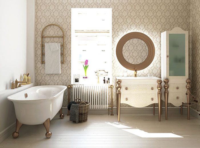 В качестве декора выступают зеркала в рамах разных оттенков или совсем без рам, сияющие серебром или золотом полотенцесушители, ножки ванны или у шкафов в виде фигур.