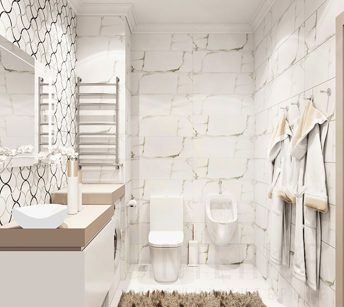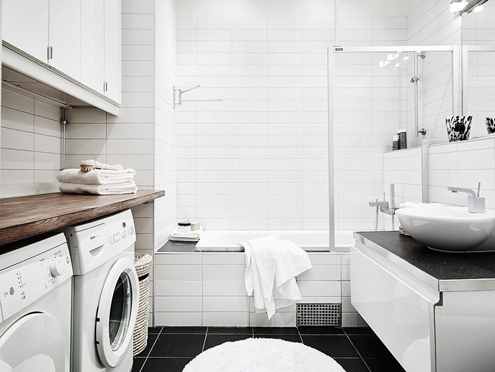 Здесь нет места лишним декорациям и ненужной мебели. Стиральная машина и ванные принадлежности прячутся в шкафах. Чтобы комната не становилась плоской, необходимо добавить несколько акцентов. Например, установить раковину из мрамора, купальню необычной формы, сделать столешницу под умывальником другого цвета.