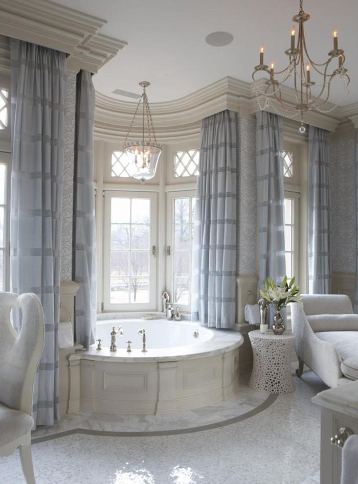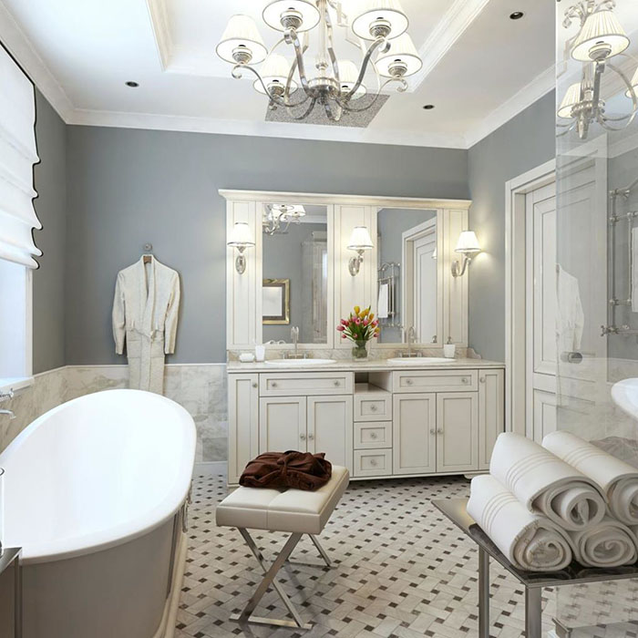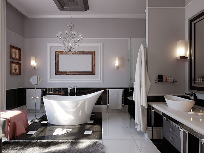 Отличается роскошью и дороговизной. Его лучше использовать в ванной комнате большого размера. Отделка часто выполняется из мрамора, стекла, дорогого дерева, металла. В качестве декора выступают бра из хрусталя, позолоченные люстры, напольные вазы. Сантехника дорогая и эксклюзивная.