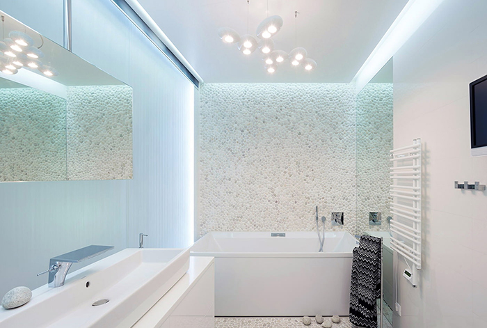 Лучшее решение для ванной – точечные светильники на натяжном потолке. Таким образом легко прикрывается проводка, облегчается монтаж. У зеркала можно встроить еще пару светильников или выбрать светодиодную ленту. Это стильно и удобно.