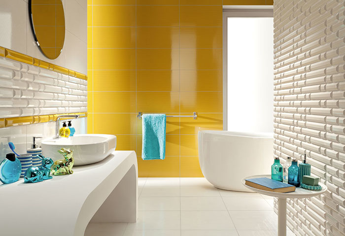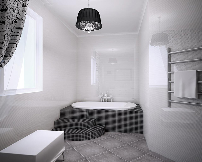 Нужного эффекта можно добиться, если использовать в отделке стен и пола материалы из белого с добавлением любого другого оттенка: черного, красного, бордового, желтого, зеленого, коричневого и т.д.