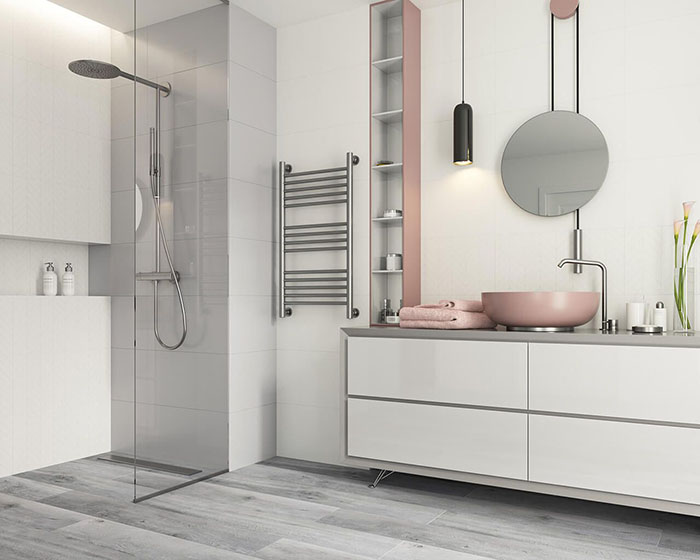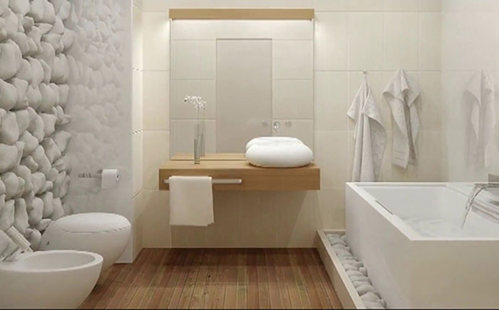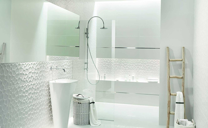 Чтобы сделать помещение красивым, для его декора следует выбрать подходящие отделочные материалы. Все они могут, при необходимости, окрашиваться в любой оттенок белого. Главное использовать те, что стойко переносят влагу.