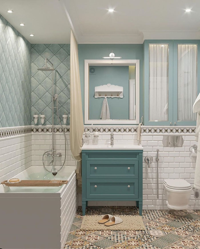 Романтичный французский стиль, который характеризуется светлой цветовой гаммой и цветочным принтом. Вместе с белым хорошо применять нежные розовые и бирюзовые оттенки. На стенах – распределить керамическую плитку или пластик под кирпич или дерево. Мебель подойдет деревянная, так получится создать уютную расслабляющую деревенскую атмосферу.