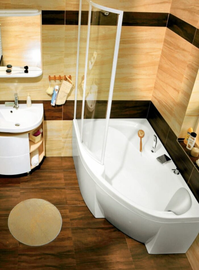 Дизайн небольшой ванной комнаты с угловой ванной, фото которого привлекает внимание многих обывателей и профессиональных специалистов, является отличным решением. Конструкция оснащена дополнительным сидением, что позволяет заменить полочку, на которой помещается все косметические средства для банных процедур. Подобная установка не предполагает обустройства дополнительных шкафчиков.