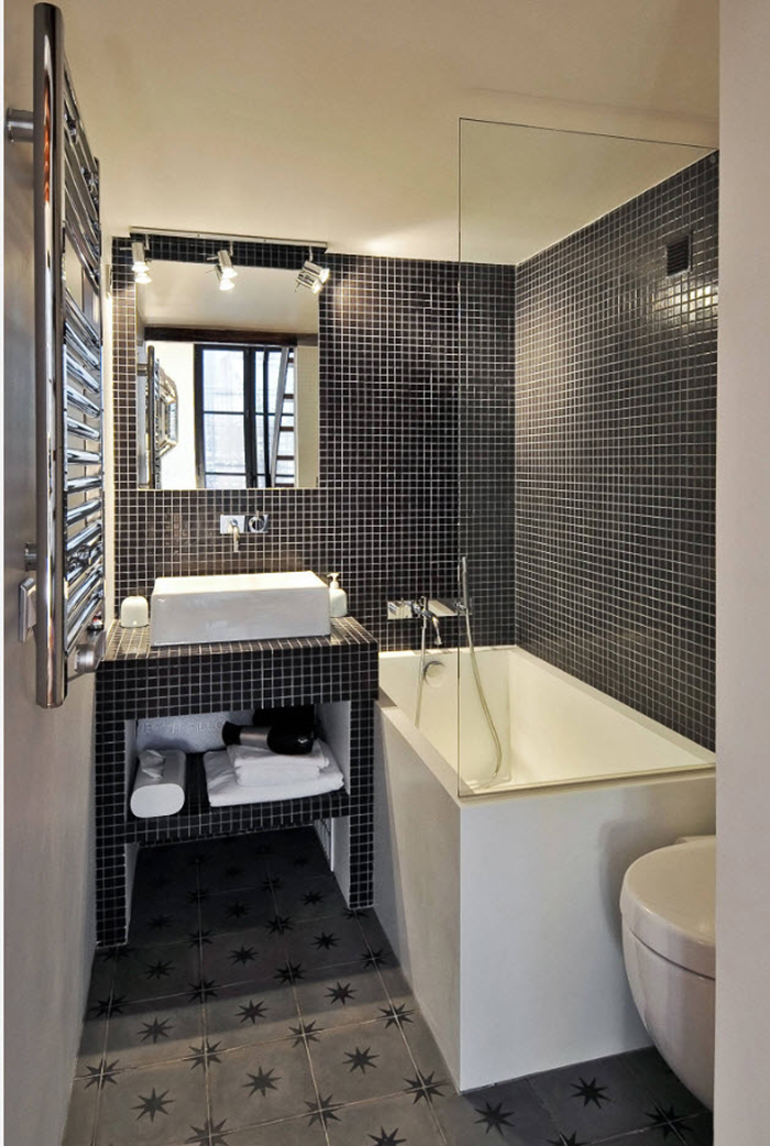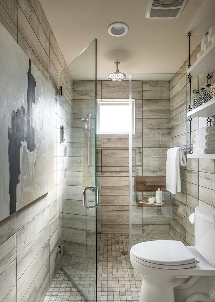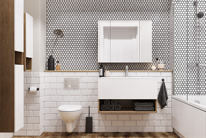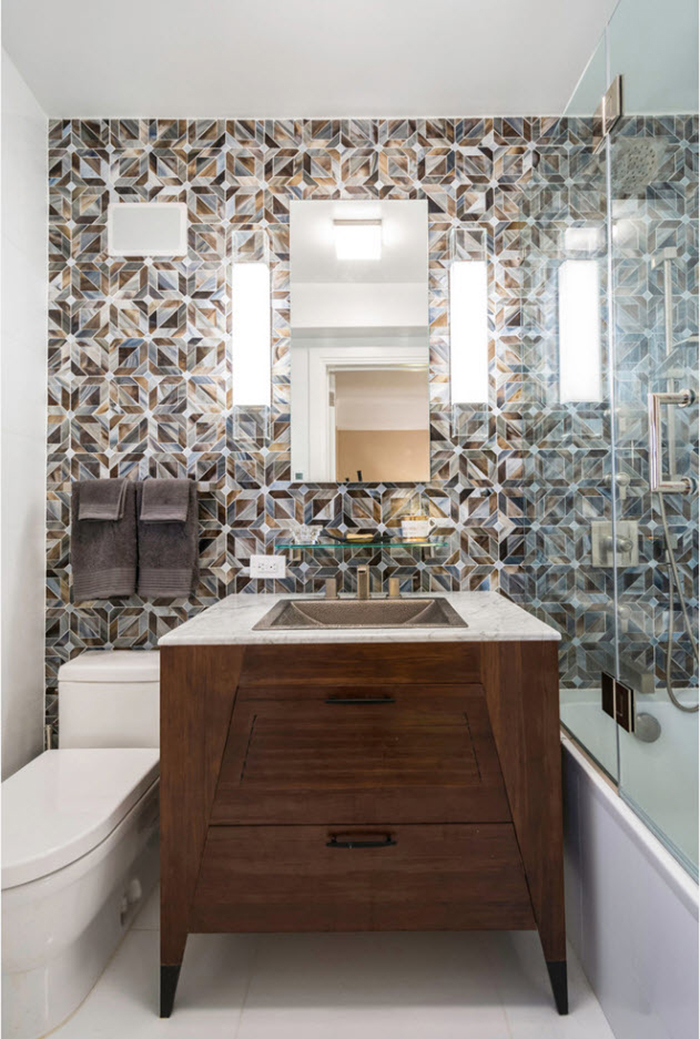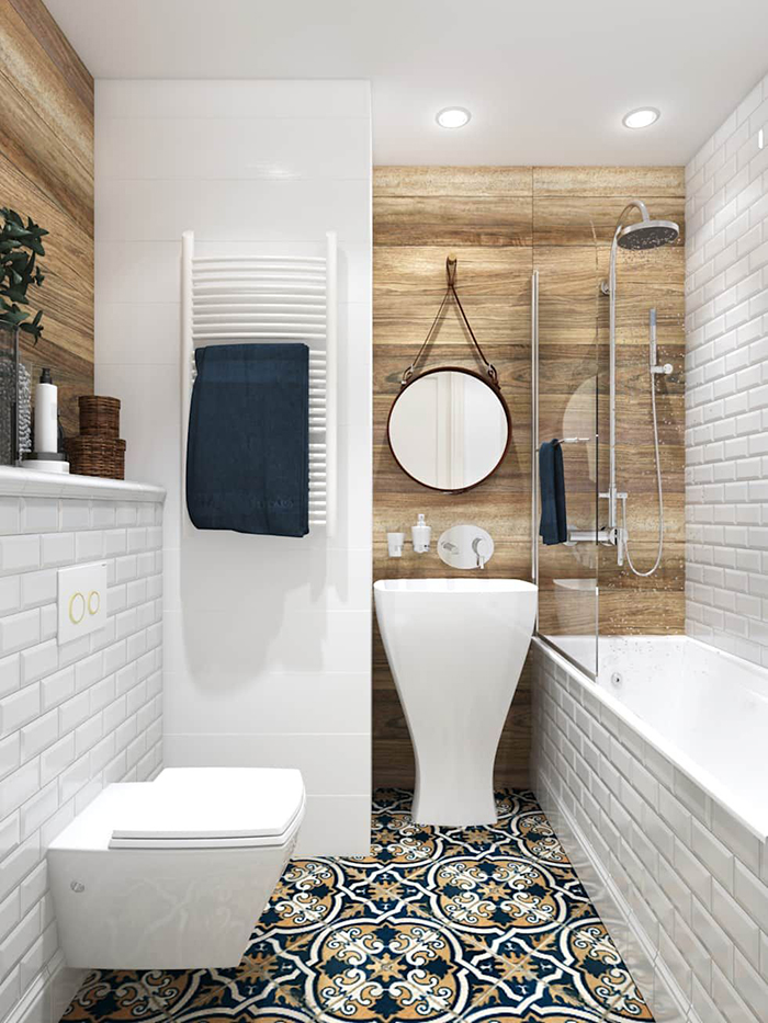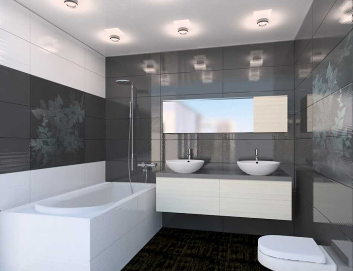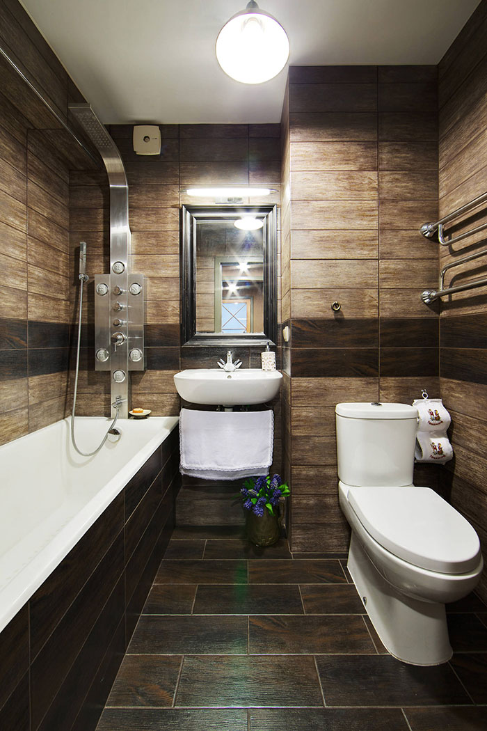 Если вы любитель контрастов, обратите внимание на акцентные сочетания вроде «темная стена – ясная стена». Эта комбинация визуально увеличит площадь комнаты. Откажитесь от кафеля слишком ярких цветов и крупноформатной плитки. И то, и другое может сыграть злую шутку и зрительно «съесть» место.
