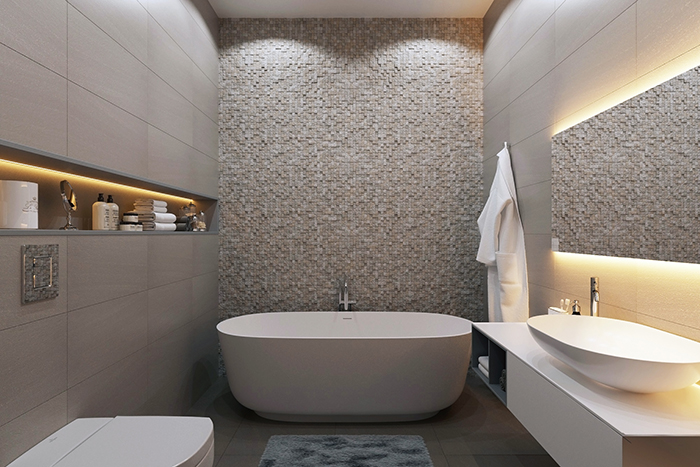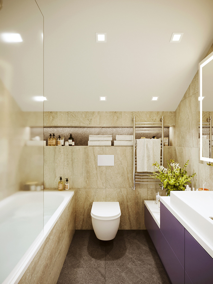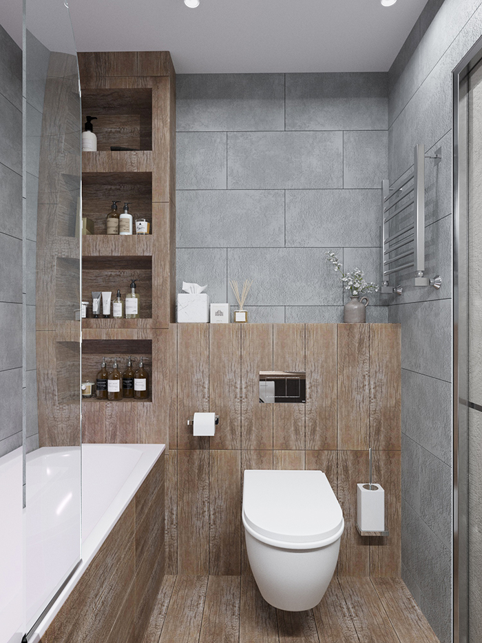 Проектируя ванную, в первую очередь обратите внимание на функциональность и комфорт. Вам должно быть удобно использовать всё, что находится внутри комнаты. При оптимальном раскладе можно сформировать не только удобный, но и изысканный дизайн. Попробуйте с помощью выступов сформировать перегородки для распределения, а в нишах установить стеллаж для средств индивидуальной гигиены и чистых полотенец.