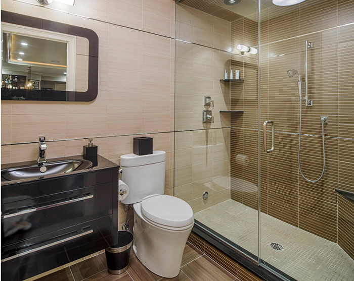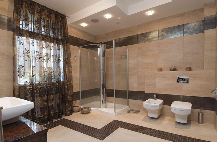 Масштабы такого помещения дают возможность устанавливать наиболее удобные модификации унитазов с большим сливным баком и дополнительными функциями.