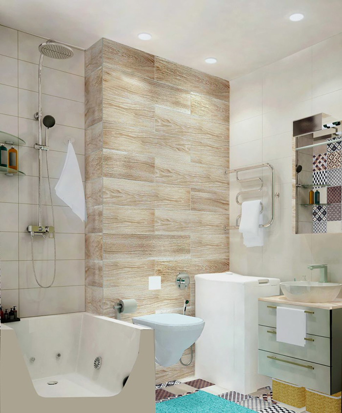 Чаще всего в этом случае применяется элементарная и многофункциональная мебель в ясных цветах. Место под раковиной сохраняют пустым или добавляют выдвижные ящики. Обязательно нужно установить в совмещенный санузел обыкновенную тумбочку с зеркалом и раковиной, душ и унитаз, а на полу разместить несколько круглых ковриков.