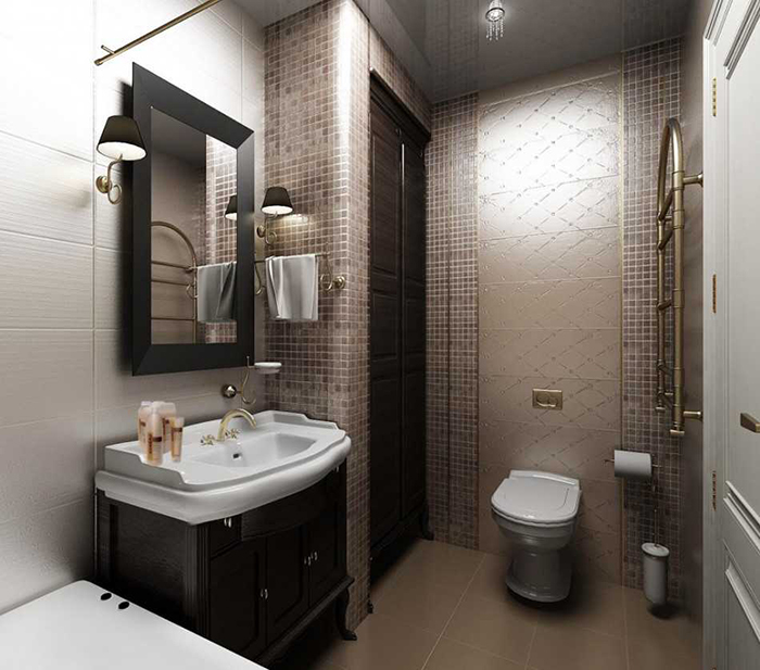 Не работать с пространством. Отказаться от работы с пространством – непростительная оплошность при оформлении маленьких комнат. Есть множество методов для визуального увеличения границы совмещенного санузла. Геометрия санузла легко корректируется с помощью подходящего зеркала, тона, подсветки, раскладки плитки.