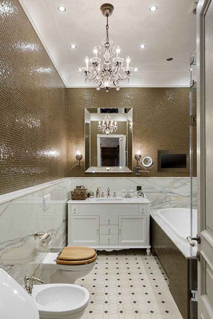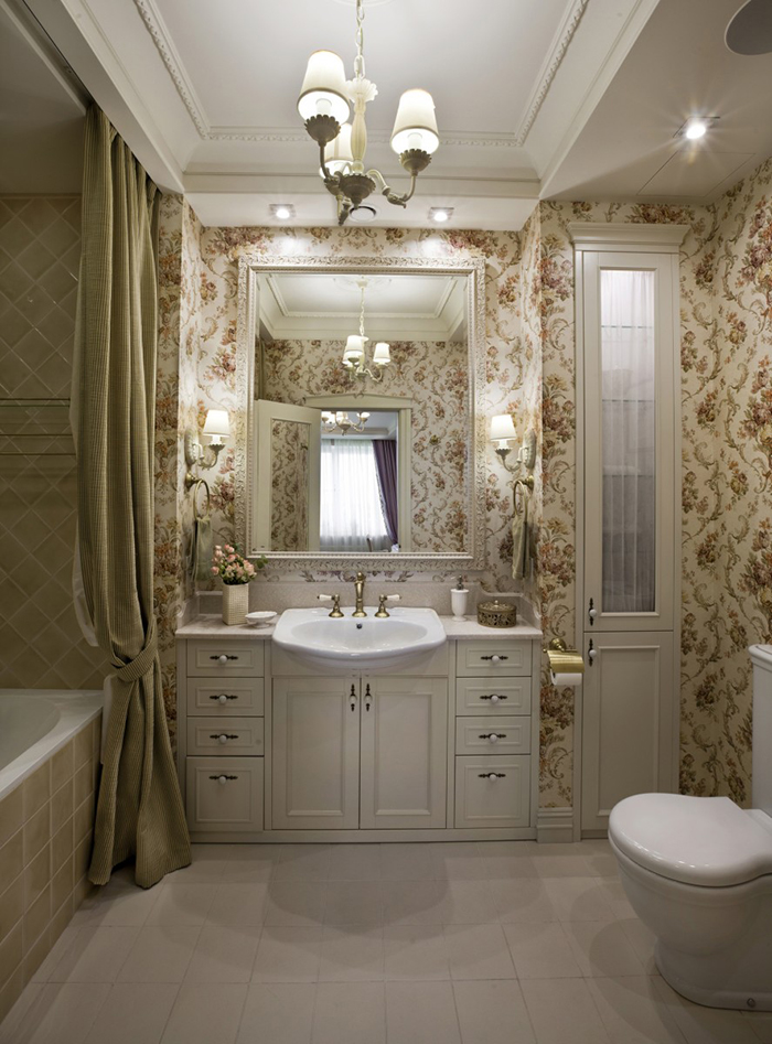 Для больших соединенных туалетов лучше выбирать цельные гарнитуры в общей манере. Идеальным стилем в этом случае станет классический.