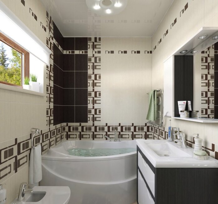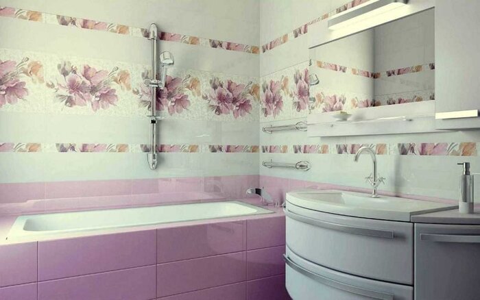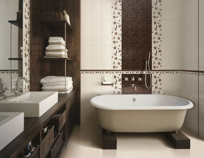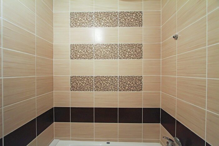 Часто комбинируют плитку, имеющую разнообразный размерный ряд. При этом плитки располагаются стык в стык, обладают стильным и оригинальным внешним видом. Рекомендуется в процессе декорирования ванной комнаты отказаться от плитки больших размеров. Внешний вид такого оформления отличается громоздкостью и значительной вычурностью.
