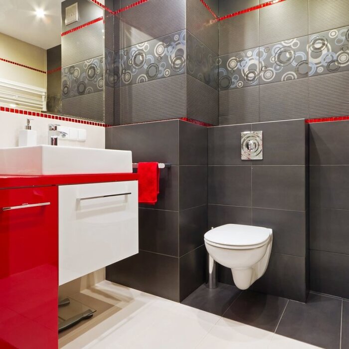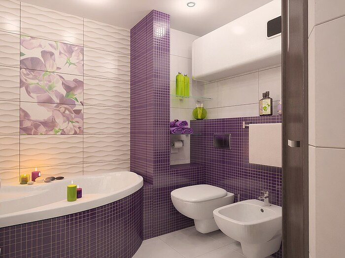Для ванной комнаты подходит выбор ярких вариантов оформления. В таком случае помещение становится островом позитива, где происходит зарядка энергии и хорошего настроя. Чтобы добиться этого, необходим выбор оранжево-фиолетового сочетаний. Интересен внешний вид красных стен, на которых нанесены акценты зеленого цвета разной степени интенсивности.