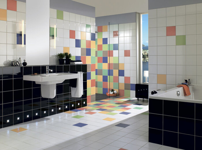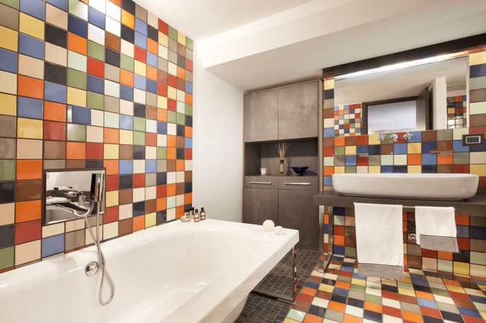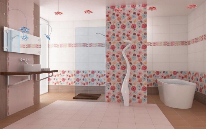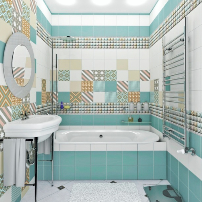 Оригинален внешний вид калейдоскопа. Это способствует получению яркого интерьера, находиться в котором сплошное удовольствие. Человек заряжается позитивом на долгое время. При раскладке комбинируется керамическая плитка в зависимости от выбранной схемы или хаотичного варианта. Оформляют комнату в нейтральных и спокойных тонах.