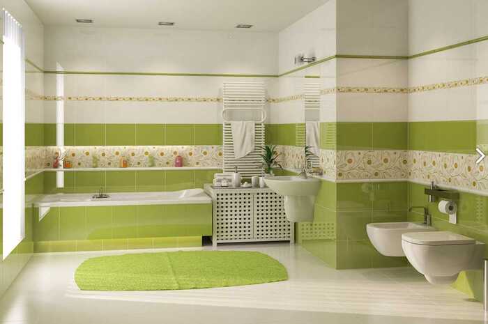 Остаются актуальными линии. С их помощью происходит разделение стены на различной высоте от пола. Оттенки двух половин могут быть аналогичными или, наоборот, быть отличными на 3-4 тона. Также смотрится красиво сочетание противоположных вариаций плитки. Чтобы создать полоски, показано применение целых полос и их обрезков.