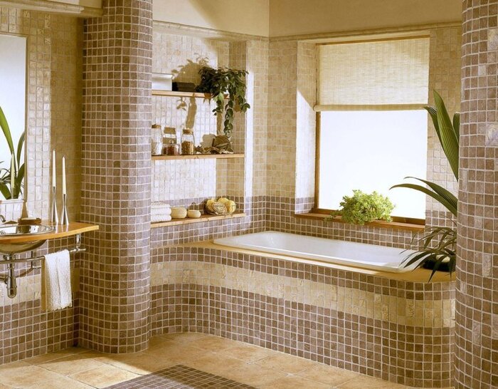 Помещение, облицованное таким способом, смотрится привлекательно. Укладывают плитку на стеновых и половых поверхностях. Чтобы выполнить работу, применяют более трех плиточных изделий, разных по размеру.