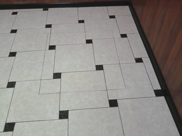 Подобный способ укладки имеет внешнее сходство с паласом, обладающим красивым и оригинальным геометрическим рисунком. Отличие плиточного ковра или панно заключается в наличии ярких узоров, нанесенных на однотонное полотно. Также интересно выглядит вариант с обрамлением, в качестве которого используется цветной бордюр.