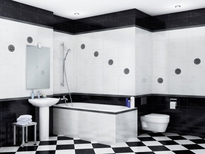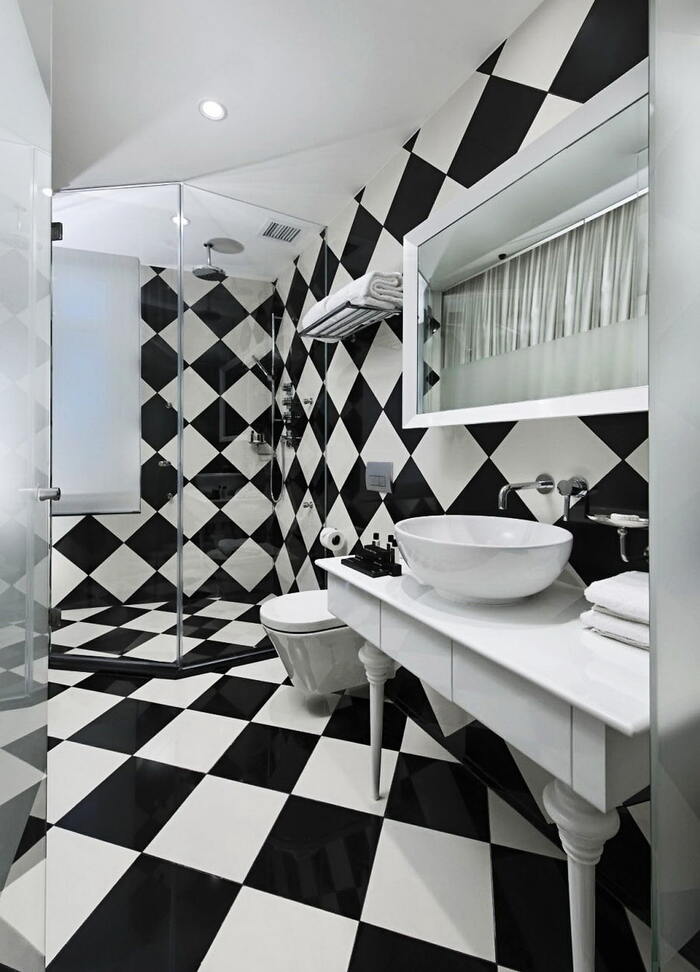 При таком способе применяют квадратную плитку в черно-белом цветовом решении. Внешне раскладка плитки на стенах в ванной имеет вид шахматной доски. Чтобы рисунок был более уместным, возможно применение других сочетаний. Привлекательно выглядят желто-синие, бело-красные, коричнево-бежевые и салатово-фиолетовые цветовые комбинации.