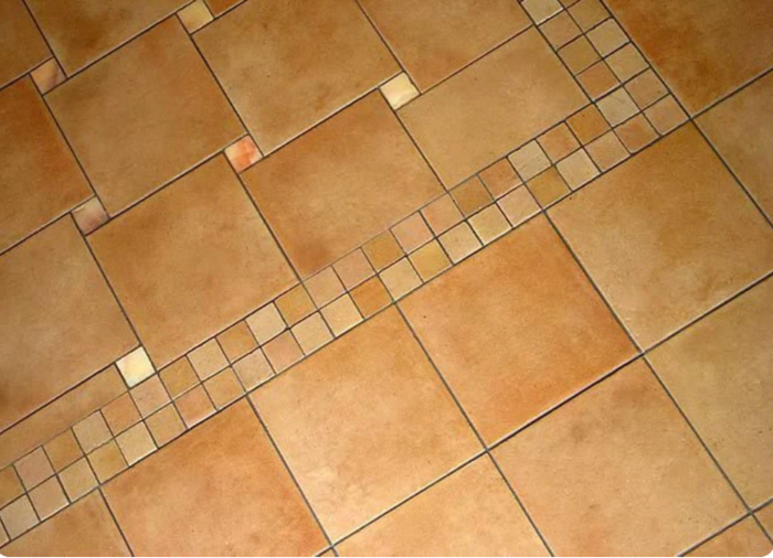 Интересным вариантом станет укладка, когда комбинируются мозаичная или кирпичная интерпретация с применением других плиточных видов. В таком случае не нужно декорировать углы. Также подобная мера позволяет разделить свободную площадь на несколько зон.